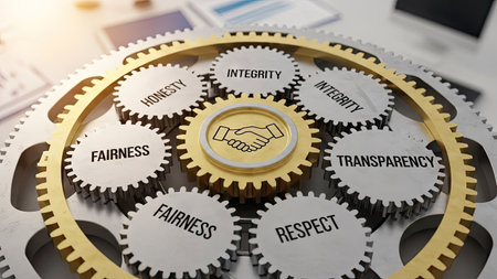 This image showcases a mechanical gear mechanism featuring various core values like honesty, integrity, and fairness. The composition is a detailed overhead shot with a metallic color scheme. It presents a symbolic representation of teamwork. This image could be used for illustrating concepts related to business ethics, partnerships, or corporate values.