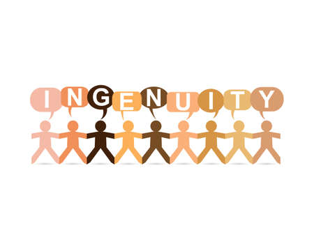 Ingenuity word in speech bubbles with cut out paper people chain in different skin tone colors