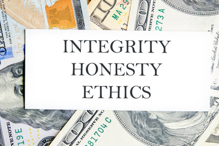 INTEGRITY HONESTY ETHICS text, a word written on a white business card against a background of money