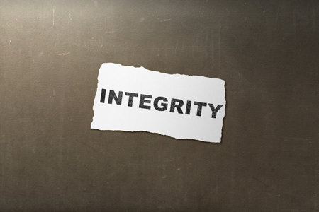 Ripped paper with integrity text on a black background. Reputation integrity concept