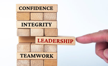 Confidence, integrity, leadership and teamwork text on wood blocks with white background. Business concept.
