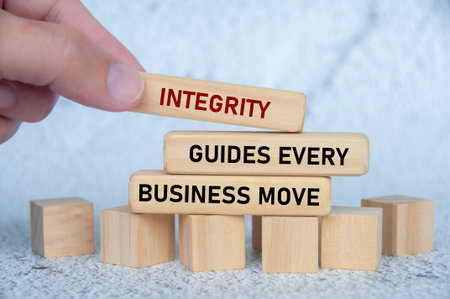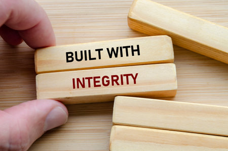 Built with integrity text on wooden blocks held by hand reflects trust, strength, and ethical values in every action