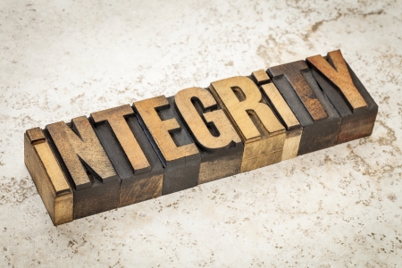 integrity word in vintage letterpress wood type on a ceramic tile background