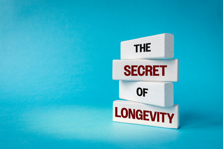 The secret of longevity, written on white blocks. Concept of health and longevity. Eating habits, positive attitude, social relationships, and physical activity. Blue background. Copy space