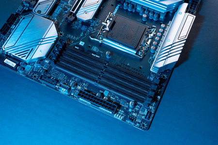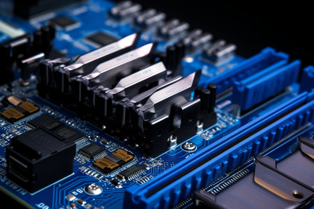 Exploring the Intricacies of Blue DDR RAM Memory Slots: A Close-up View of Motherboard's Hardware Co