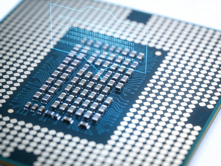 Close up of a computer processor with microchips and binary code