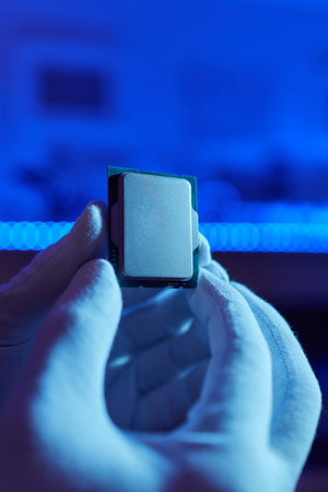 Hand in white glove holding a CPU computer processor microchip.