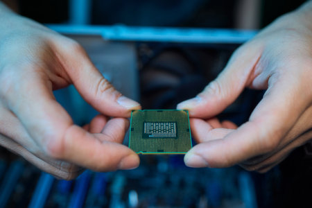 Plug in CPU microprocessor to motherboard socket. technological background. Concept computers hardware.