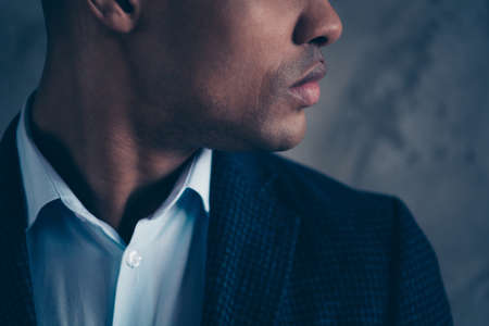 Profile side view cropped photo of gorgeous intelligent collar career executive look think plan thoughtful short hair bald decide solve choose wear modern outfit jacket isolated on dark background.