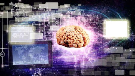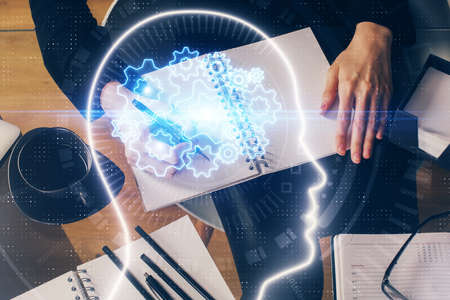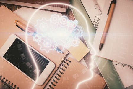 Multi exposure of brain sketch hologram over topview work table