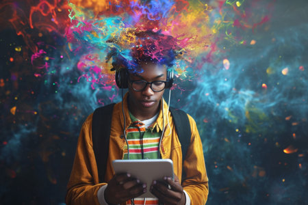 An African-American student with a tablet in his hands and headphones on a surreal background. 3d illustration.