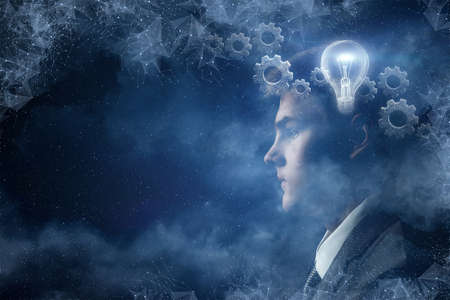 The concept of constructive brainstorming. Businessman with mechanism thinking head.