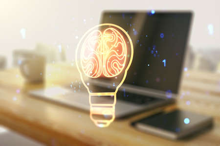 Creative light bulb illustration with human brain and modern desktop with pc on background, future technology concept. Multiexposure