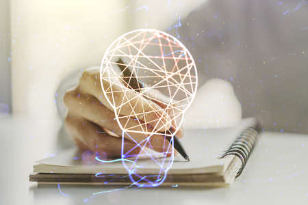 Creative light bulb with human brain hologram and with woman hand writing in notepad on background, artificial Intelligence and neural networks concept. Multiexposure