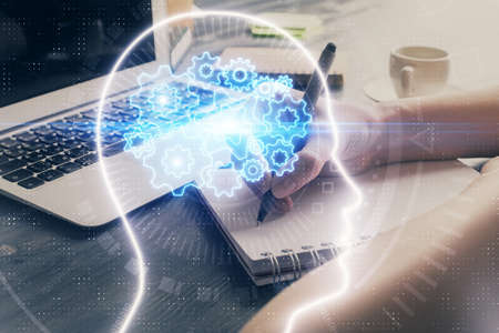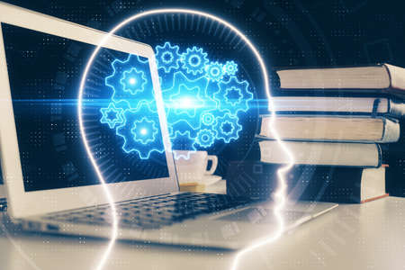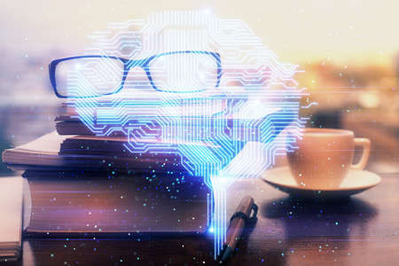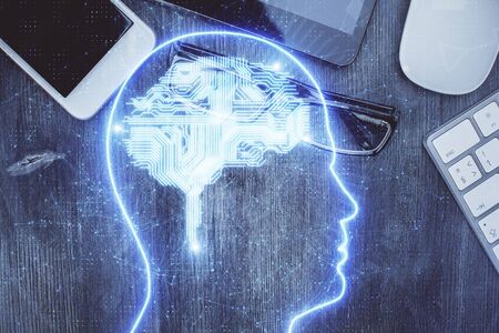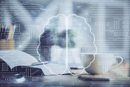 Double exposure of desktop with computer and brain drawing hologram. Artificial intelligence concept.
