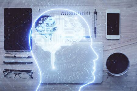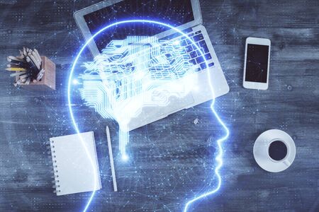 Multi exposure of brain sketch hologram over topview work table background with computer. Concept of big data.