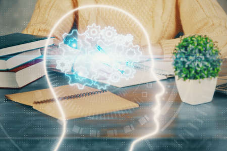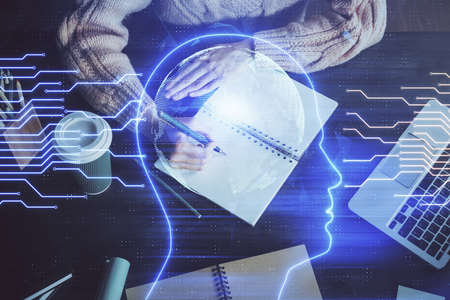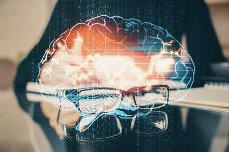 Multi exposure of writing hand on background with brain hologram. Concept of learning.