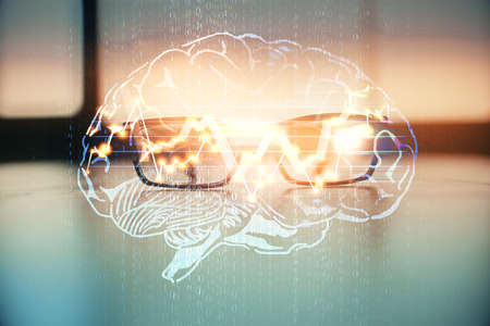 Brain drawings with glasses on the table background. Double exposure.