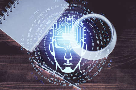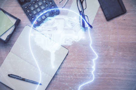 Multi exposure of brain drawings and desk with open notebook background. Concept of AI
