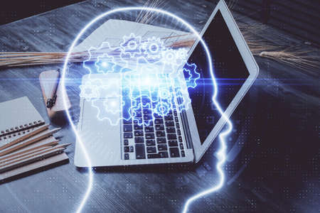 Creative artificial Intelligence concept with human head hologram on modern laptop background. Multiexposure