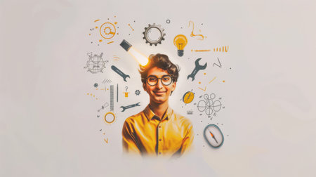A young man with glasses is smiling and wearing a yellow shirt. The image is filled with various symbols and drawings, including a light bulb, a wrench, and a compass. Scene is one of creativity