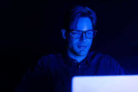 Developer in eyeglasses looking at blurred laptop isolated on black