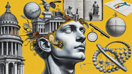 A thought-provoking digital collage combining elements of classical sculpture, scientific instruments, and ancient architecture. The composition features a Greco-Roman statue head filled with symbols of knowledge—telescopes, manuscripts, globes, and mathematical diagrams—set against a bold yellow background