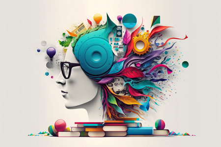 An artistic representation of a human profile featuring vibrant colors and symbolic elements. Inside the head, a wave, sun, and a representation of a brain are visible. The composition uses bright colors and textures against a dark background, suggesting a concept relating to thought, creativity, and the mind. It is suitable for various commercial uses.