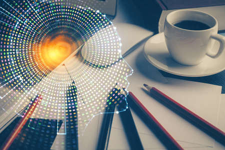 Double exposure of brain drawing hologram over topview work table background with computer. Concept of big data.