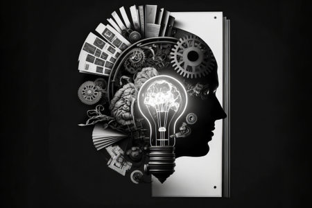 A vibrant, abstract collage featuring a human face with gears, light bulbs, and other symbolic elements.