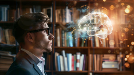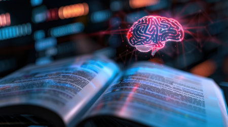 This image illustrates the intersection of artificial intelligence and knowledge, depicting a glowing brain emerging from an open book in a digital landscape.