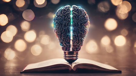 AI generated image. Creative brain Idea and light bulb, brain and book concept ,Business and education concept