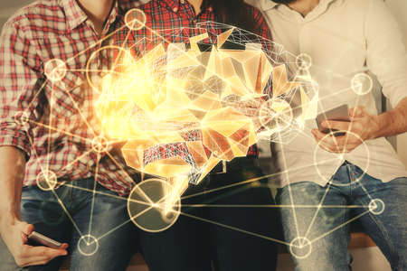 Double exposure of man and woman working together holding and using a mobile device and brain hologram drawing.