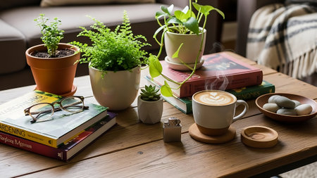 A serene living room setting with a wooden table featuring a cup of coffee, a stack of books, and a potted plant, surrounded by comfortable furniture and soft lighting.