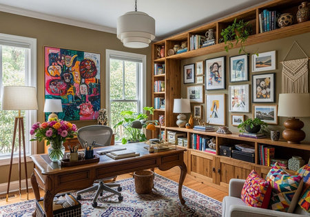 A vibrant and colorful home office with a desk, chair, and plants in a cozy atmosphere