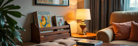 Cozy living room with elegant lamp and artful magazine holder on wooden table. That the image is generated using AI.