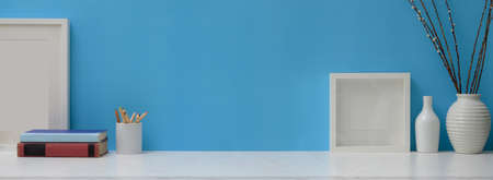 Close up view of creative home office desk with mock-up frames, books, stationery, ceramic vases and copy space
