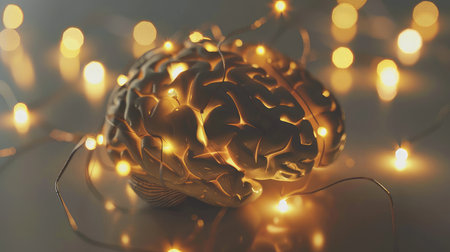 A creative representation of a human brain next to vibrant building blocks on a wooden table, symbolizing thinking, learning, and innovation in a modern workspace.
