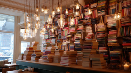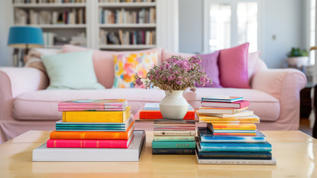colorful books flat illustration coffee table, living bright, airy arranged colorful books flat