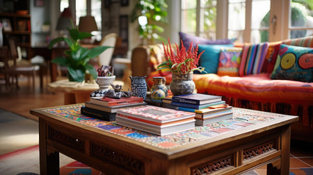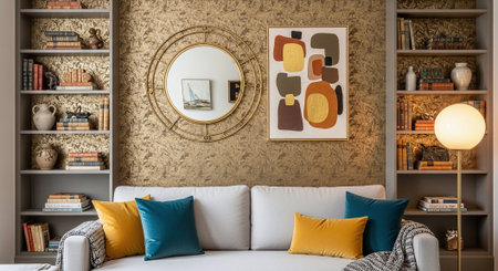 Mid-century modern elegance meets vibrant textiles in this curated shelf display. Books, art, and crystals enhance the aesthetic charm. Generated A.I.