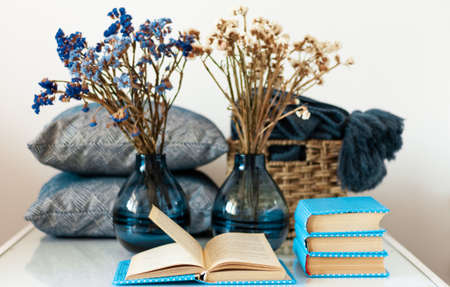 Cozy home interior decor: stack of books, vase with flowers on a white table. Distance home education. Quarantine concept of stay home