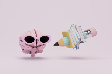 the concept of women's education. brain in rose-colored glasses next to books strung on a pencil. 3D rendering.