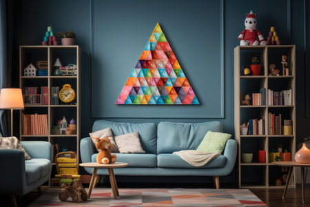 Children's room interior with a blue sofa and a toy pyramid. 3d rendering