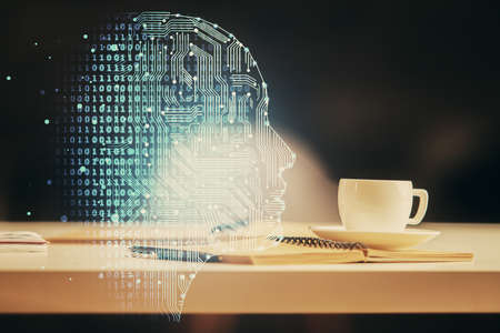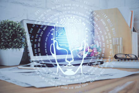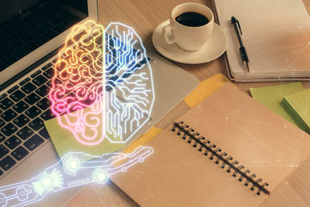 Double exposure of desktop with computer and brain drawing hologram. Artificial intelligence concept.