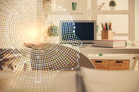 Double exposure of work space with computer and human brain drawing hologram. Brainstorm concept.