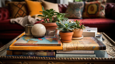 A warm, inviting living room with a coffee table featuring a mug, glasses, books, and a plant. A comfortable sofa with pillows and a cozy blanket is visible.