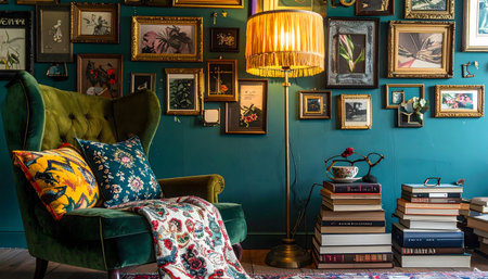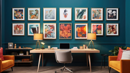 This artistic interior showcases a curated collection of framed art, plants, and decorative elements, blending style and comfort. A feast for the eyes, this scene is inspired by modern aesthetics. Generated A.I.