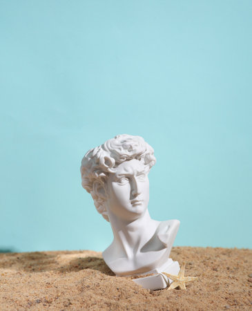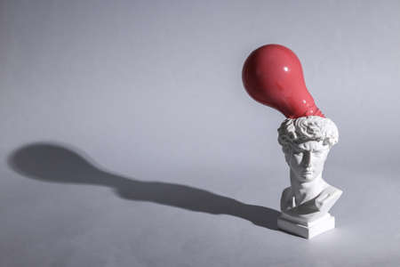 Antique David bust with pink light bulb on gray background. concept pop. Minimal still life. creative ideas