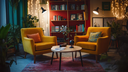 Cozy living room with yellow armchairs, bookshelf, coffee table and lamps