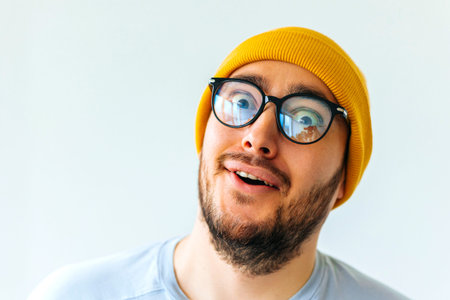 front view of a portrait of a bearded man and eyeglasses. male with closed eyes and yellow hat